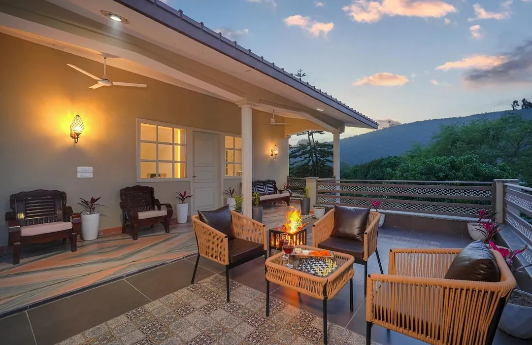 The kitchen amenities at Saffronstays Mont Tierra - 4Br Modern Villa With Lawn, Bonfire, Indoor Games & Themed Rooms, Dehradun feature an electric kettle, a fridge, and glassware, provided in an outdoor dining area. Saffronstays Mont Tierra - 4Br Modern Villa With Lawn, Bonfire, Indoor Games & Themed Rooms, Dehradun provides access to Dehradun train station, which is around 10 km away.